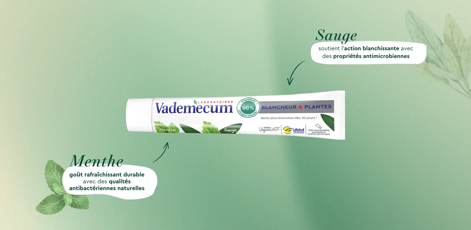 La formule végétalienne de Blancheur & Plantes au fluor contient 98% d'ingrédients d'origine naturelle* et utilise le pouvoir des plantes :